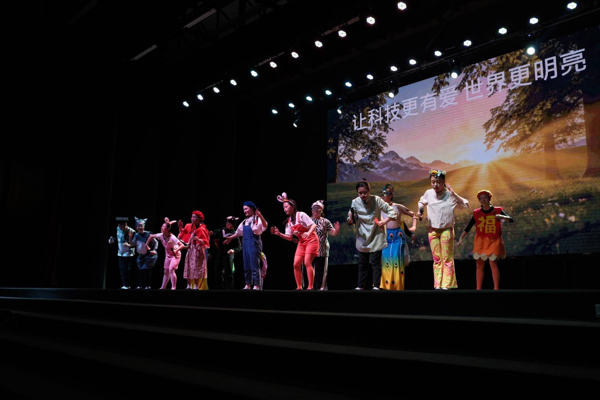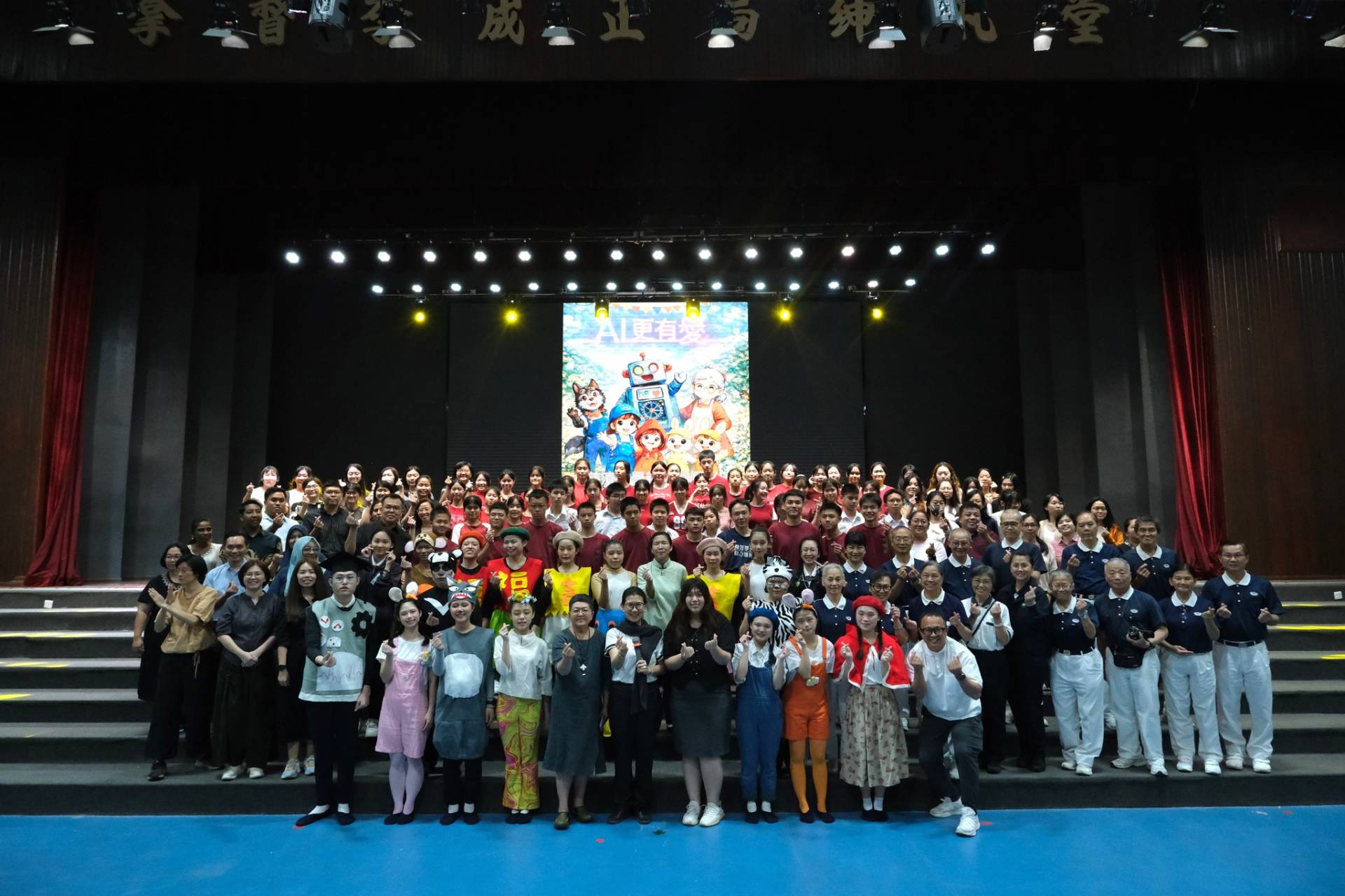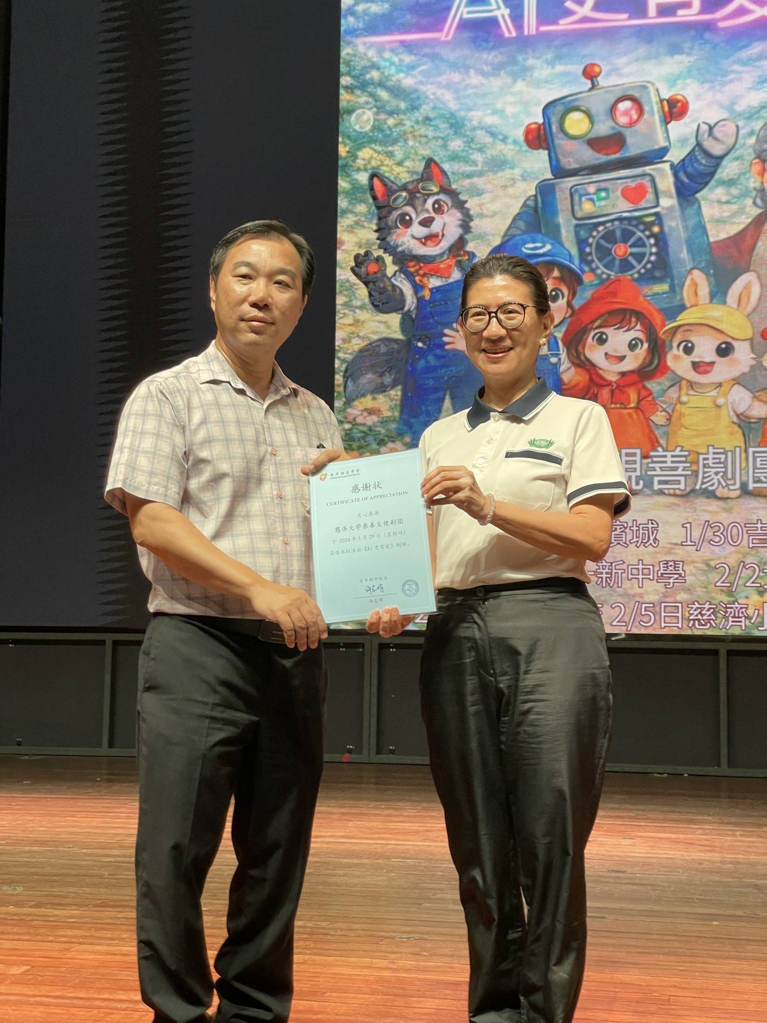 在谢幕环节中,谢丽华博士特别向师生分享创作理念,指出剧中多首歌曲由 AI 技术制作完成,不仅为表演增添创新特色,也让观众亲身感受到科技与艺术融合所激发的无限可能。谢博士亦表达对本校师生参与演出的感谢,并期盼未来能再次到校交流,共同分享更多科技与人文教育的实践经验。